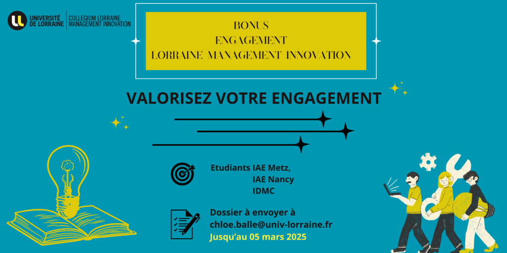 Le Collegium Lorraine Management Innovation, dont font partie l’IAE Metz, l’IAE Nancy et l’ IDMC, pilote son propre dispositif de reconnaissance de l’engagement étudiant et de valorisation des compétences acquises. De ce fait, le bonus étudiant engagé LMI se substitue au B2E de l’Université de Lorraine pour les étudiantes et étudiants inscrits dans l’un des instituts du Collegium LMI.
